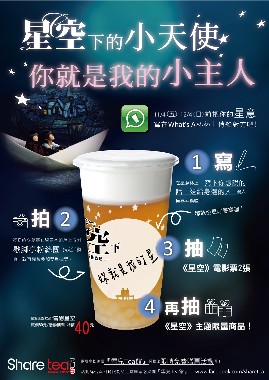 1.活動期間Po有留言的”What’s A 杯杯”的星意照片到『雪兒Tea館』即有抽獎資格,另有創意人氣獎20名!